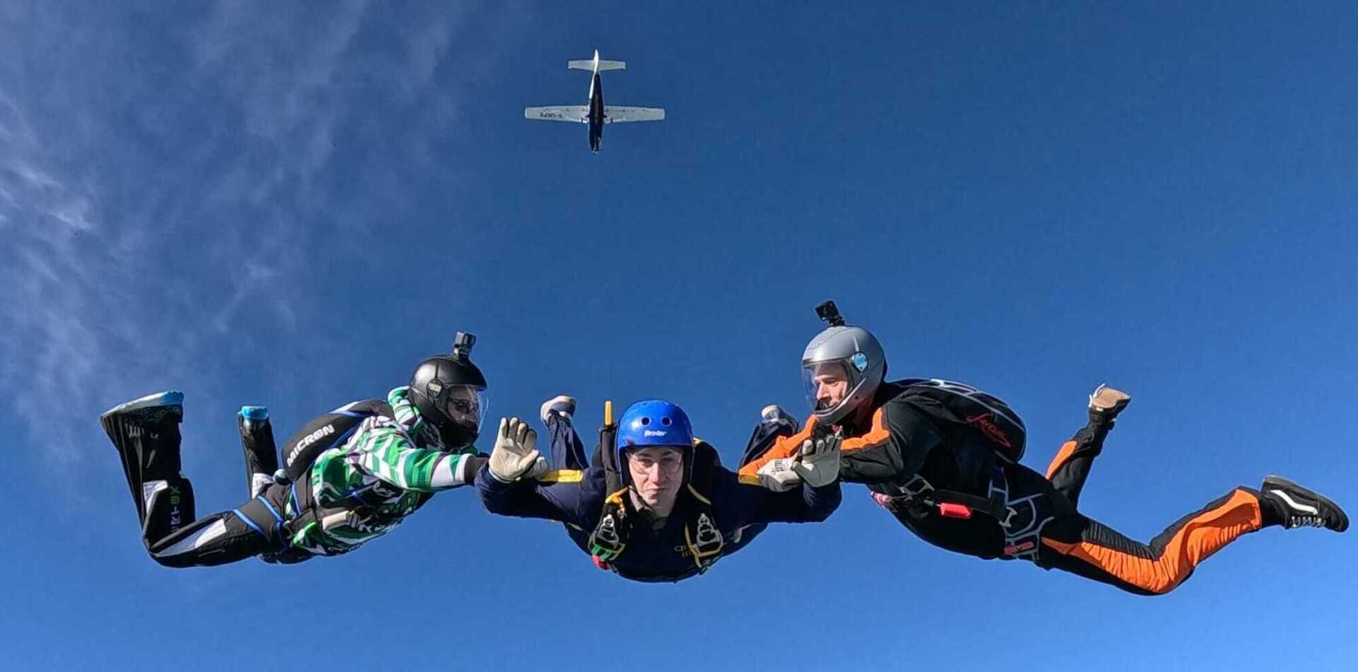 We are a skydiving academy teaching people from all walks of life how to skydive solo, We also facilitate progression training for experienced skydivers. We train our first timers through the AFF program (Accelerated freefall). After a day of ground school training learning essential skills such as body position, altitude awareness, and emergency procedures we then take to the Skies. For levels 1-3 the student exits the aircraft with 2 instructors who give in time corrections through the use of hand signals. levels 4-8 are with one instructor these levels are to learn new skills, how to turn, regain stability, and track (moving forward). all skydives are recorded for feedback and for the student to take home.